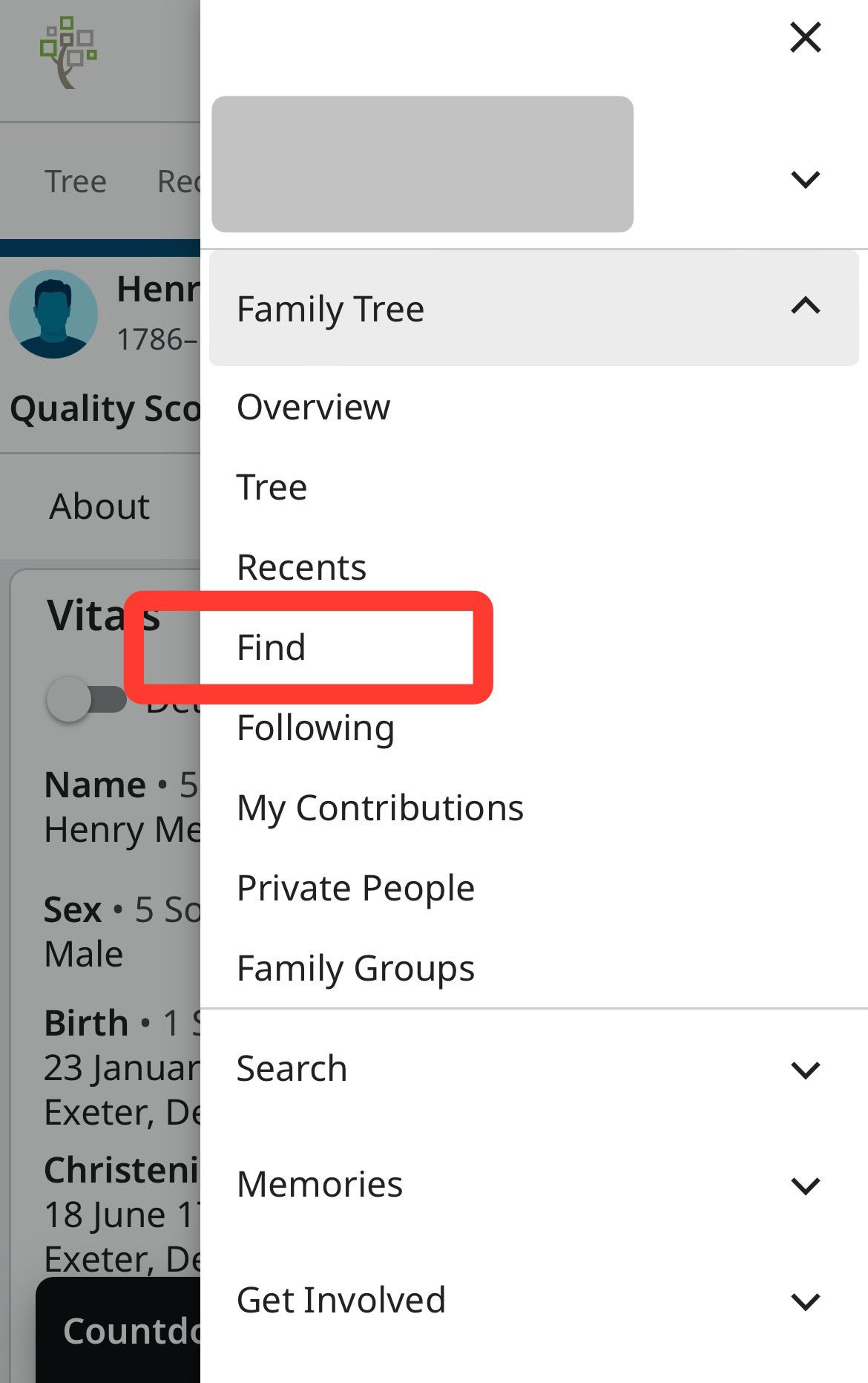 3.) To take advantage of the genealogy work others have done on the site, and speed up the process, see if a public profile has already been made for your nearest deceased relatives. Go to the “find” page.