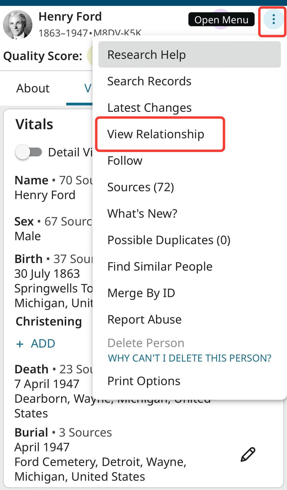 8.) Click “view relationship” on their profile and the site will determine the relation based on the site’s existing connections (you may be more related to a given individual — the site just hasn’t been provided with the proper linkages).