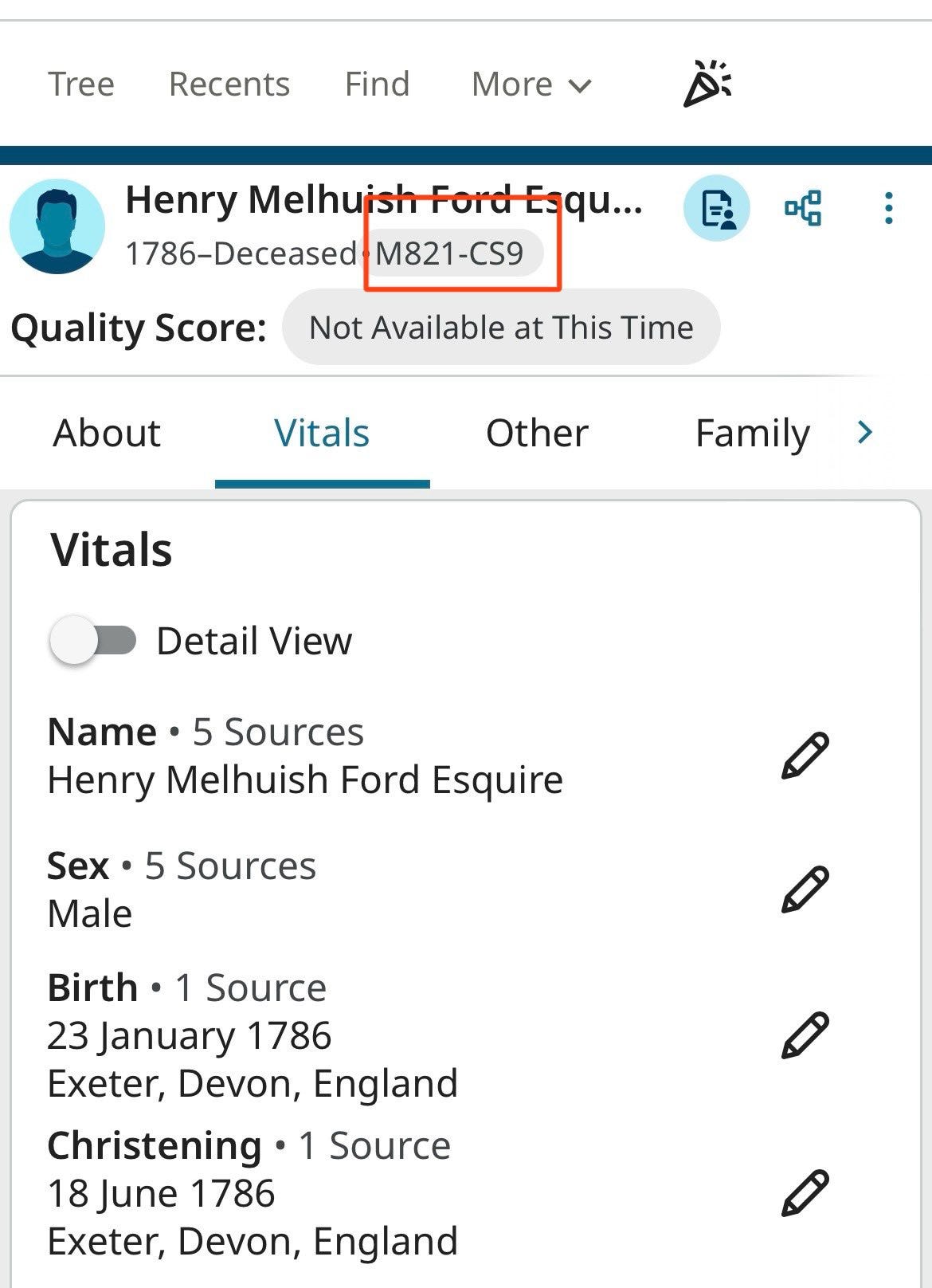 (Note: only deceased relatives will have a public profile that can be shared across FamilySearch accounts. Each relative will have a unique ID number.)