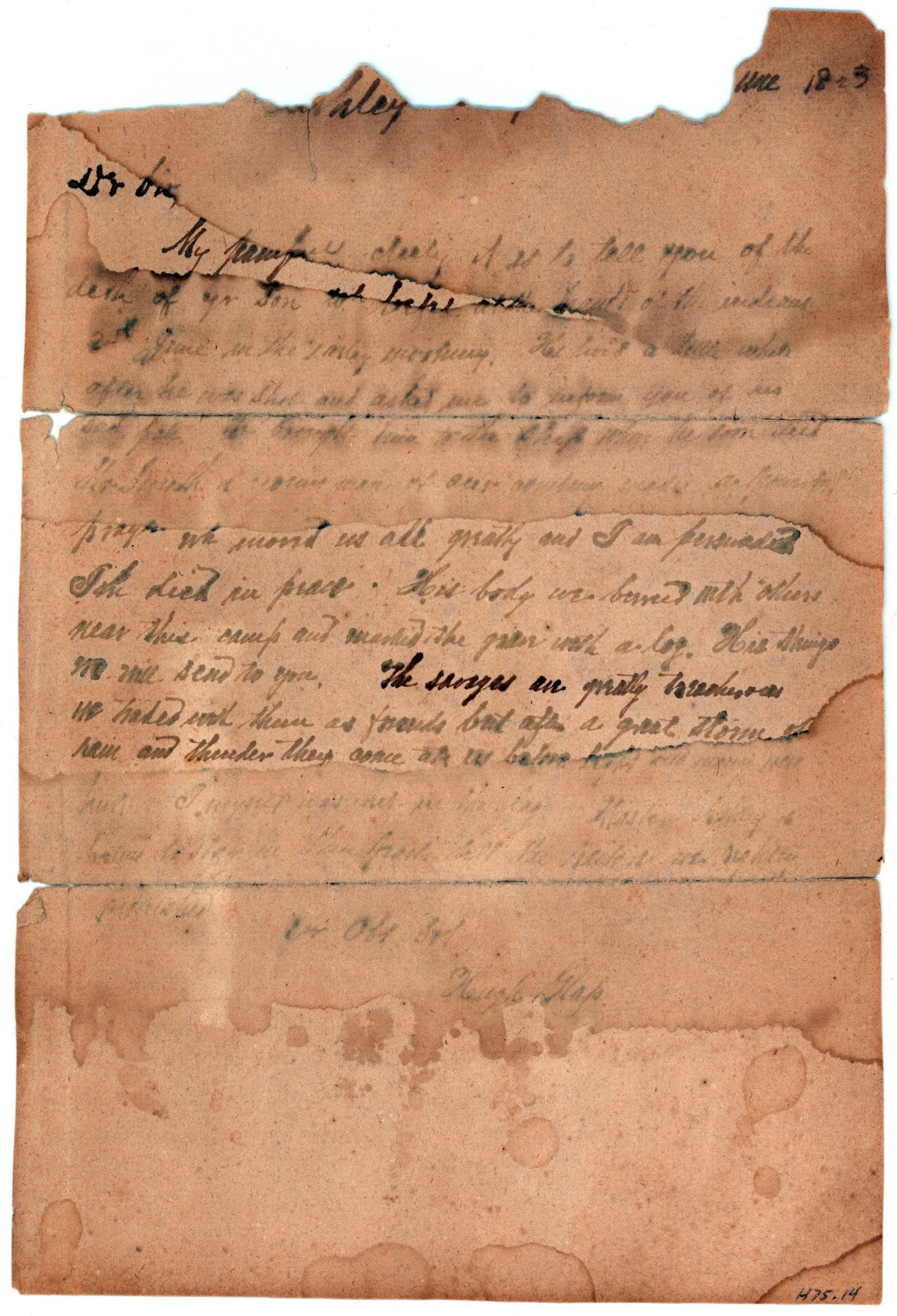My painfull duty it is to tell you of the deth of yr son wh befell at the hands of the indians 2d June in the early morning. He lived little while after he was shot and asked me to inform you of his sad fate. We brought him to the ship when he soon died. Mr. Smith young man of our company made powerful prayr wh moved us all greatly and am persuaded John died in peace. His body we buried with others near this camp and marked the grave with log. His things we will send to you. The savages are greatly treacherous. We traded with them as friends but after great storm of rain and thunder they came at us before light and many were hurt. I myself was shot in the leg. Master Ashley is bound to stay in these parts till the traitors are rightly punished.