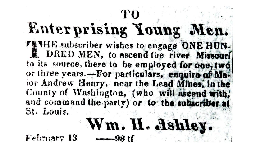 While in St. Louis, he read an advertisement for the Rocky Mountain Fur Company — otherwise known as “Ashley’s Hundred”.