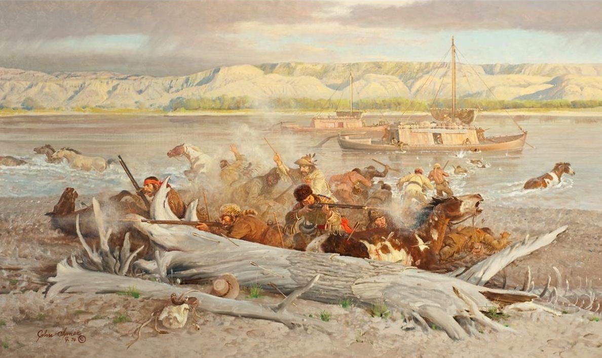 The Arikara, aiming over their palisade, fired a volley of bullets at the unprepared Americans. Several of the company’s men, and their horses, fell dead upon the shore. Those who survived the first blast, Hugh Glass being one of them, barricaded themselves behind the large bodies of the slain horses and returned fire. Glass was shot in the leg. The men in the keelboats, whether out of fear or confusion, did not move ashore to assist the overland group despite Ashley’s command to do so. Finally, one of the keelboats began moving toward the shore and the skiffs began drawing fire from the Ree. The bullets hailed down upon the men as they fled. Some scrambled for the keelboats. Others tried swimming away. Some of the weak and wounded were lost to Missouri’s current.