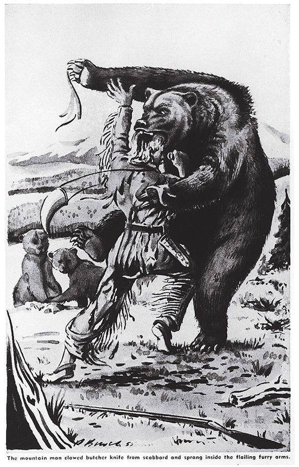Hugh Glass, while quietly wading through the sticks, walked upon a monstrous sow grizzly bear and her two cubs. He had not seen them until he was too near and too late.
